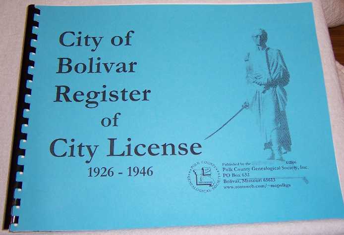 City of Bolivar Register of City License 1926-1946 2006 Polk County Genealogical Society, Inc. Soft cover with comb binding, 8.5 x 11 inches. A transcription from the original ledger book. Indexed. 148 pages. |